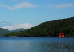 箱根火山のカルデラ湖である芦ノ湖(海抜724メートル)の周囲は約19キロメートル、湖面積6.9平方キロメートル。水温は真冬でも4度以上あり、凍結することはなく、冬鳥が飛来してきます。江戸時代までは江戸時代までは箱根神社の境内の一部であり、「箱根権現御手洗(はこねごんげんみたらしのいけ)」と呼ばれ、祭祀を執り行う聖なる湖でした。芦ノ湖の向こうには、霊峰・富士山が美しい姿を見せます。