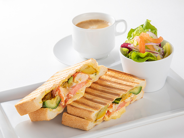建築としても有名な『ポーラ美術館』内のカフェ。お店イチオシの「オマール海老のホットサンド」は、オマール海老に加え、カレー風味のグリル野菜やチーズなどを贅沢に使い、ホワイトソースで仕上げた食べ応え抜群の一品。