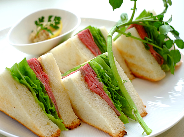 箱根強羅公園の噴水池前に佇むサンドイッチ料理店。国産和牛を使った自家製ローストビーフは、柔らかく食べ応え抜群。シャキッとしたレタスの食感と相まって絶妙な味わいを楽しめる。隠し味の特製ソースと一緒に召し上がれ。