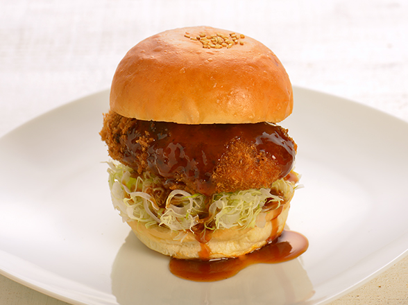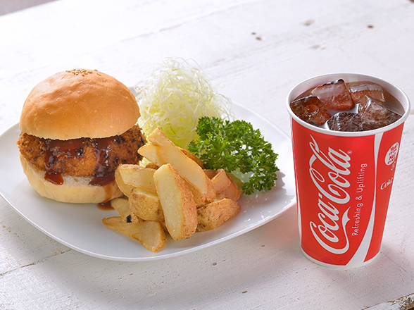 箱根湯本駅横断デッキ(湯悠デッキ)直結のフードコート。箱根のブランド豚である「箱根山麓豚」を使用したメンチをハンバーガーに仕上げた「メンチカツバーガー」はボリューム満点。箱根の水で淹れるコーヒーとともに。