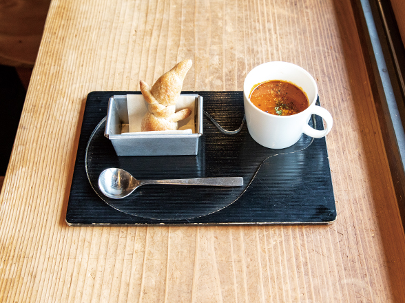 『奈良屋旅館』の従業員寮だった古民家をリノベーション。足湯やギャラリーも併設し、季節ごとのイベントも多数開催している。「本日のスープセット」は、日替わりスープに小田原『Les Rois』特注パンの組み合わせ。