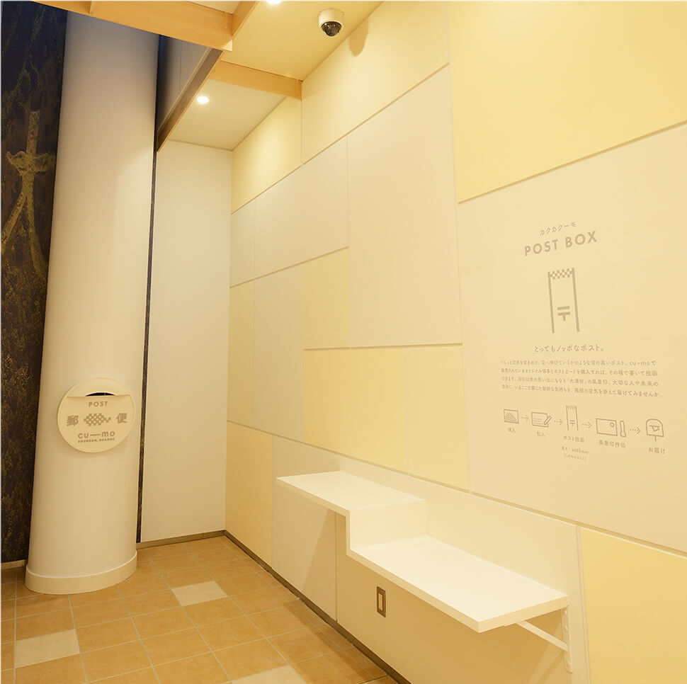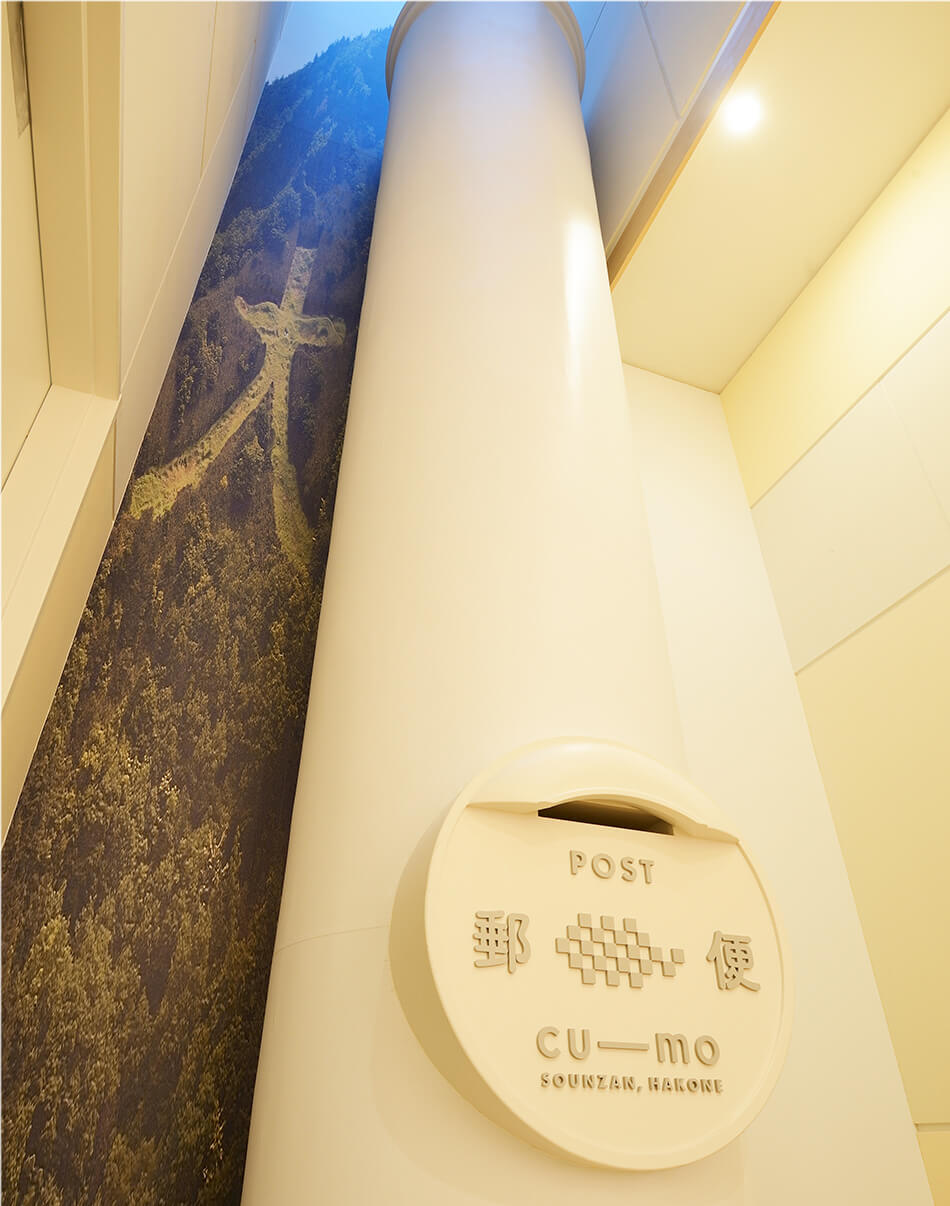ぐんっと天井を突きぬけ、空へ伸びていくかのような背の⾼いポスト。cu―mo で販売されているオリジナル切⼿とポストカードを購⼊すれば、その場で書いて投函できます。消印は旅の思い出にもなる「⼤涌⾕」の⾵景印。⼤切な⼈や未来の⾃分に、いまここで感じた新鮮な気持ちを、箱根の空気を添えて届けてみませんか。