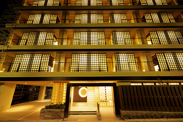 平成27(2015)年、須雲川沿いにオープンした「月の宿 紗ら」は、洗練されたデザイナーズ湯宿。「夜空に浮かぶ月」をイメージし、館内の随所に月をモチーフにした装飾や寄木細工があしらわれています。空間に現代的なセンスが活かされている一方、おもてなしには伝統の湯宿精神が息づいており、至れり尽くせりの滞在が叶います。緑が間近に迫る最上階の温泉露天風呂。心地よい自然の声に耳を澄ましながら癒やされます。「シャンプーバー」を用意しており、ボディソープやシャンプー、コンディショナーがあります。旅先でもスキンケアやヘアケアに気を配れるのも嬉しいポイントです。清流に面した大浴場は畳敷きなので、冷えやすい女性の足元にもやさしい仕様。10の効能を持つアルカリ単純泉が旅の疲れを癒し、明日への活力を与えてくれますよ。入浴後は、ビールやスパークリングワインがそろう3階フリードリンクコーナーで喉を潤せます。雲のない夜は屋上庭園で「夜空に浮かぶ月」を愛でながら、湯上がりのひと時を楽しんではいかがでしょう。