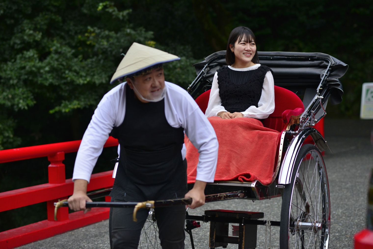 箱根湯本の雄大な自然と風流な街並みを、いつもと違った角度から楽しみたい方は、「人力車 海風屋」へ。箱根湯本駅からほど近い「あじさい橋」に乗り場があり、20分・40分・60分のコースの中から案内してもらえます。立ち寄るスポットはさまざまなので、俥夫と相談しながら選択しましょう。赤や黄に色づく早川沿いをスタートしたら、ゆっくりペースで景色を眺めたり、俥夫おすすめのフォトスポットで記念撮影したり、アトラクション感覚でアップダウンを楽しんだりと、盛り上がるポイントがたくさん。「また乗りたい」と思えるほど、充実したひとときを過ごせます。人力車には高さがあり、周りの目が気にならないのも嬉しいポイント。事前に相談しておけば複数台での移動もできます。どのコースでも地域クーポン(アプリ/紙)が使えるので、グループや家族での思い出作りにもおすすめです。