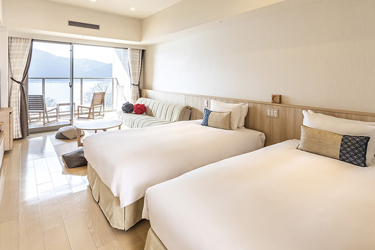 映えるフォトスポットの多いおしゃれで非日常感あふれる施設の中でも、水盤テラスでの撮影はお忘れなく。フロントスタッフにお願いすれば快く応じてもらえます。ウェルカムドリンクを片手に、テラス横の足湯でひといきつくのもいいですね。タオルが常備されているので、通りすがりに準備なしで利用できます。お子さま連れにおすすめの部屋は、芦ノ湖を行き来する海賊船が眺められる湖畔側、ソファ付きの部屋です。露天風呂付きなどタイプがいくつかあるので、希望に合わせて選びましょう。