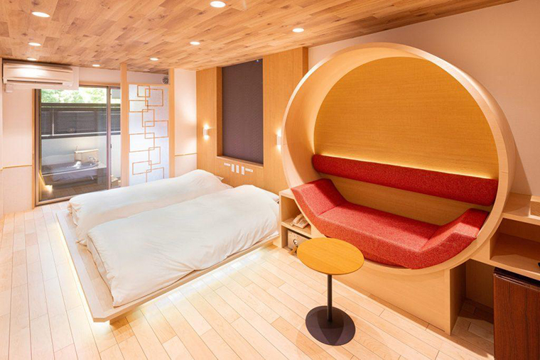 客室は明るくシンプルで機能的なデザインとなっており、リーズナブルながら快適な滞在を約束してくれます。2024年3月には、人気の露天風呂付客室がリニューアルされ、より過ごしやすいお部屋へと生まれ変わりました。源泉かけ流しの露天風呂にシャワーが併設され、使い勝手も向上。さらに、2024年7月にリニューアルした、丸いソファがアイコンの露天風呂付ツイン客室はカップル旅行にもうってつけ。高コスパで客室露天を楽しみたい人におすすめです。
