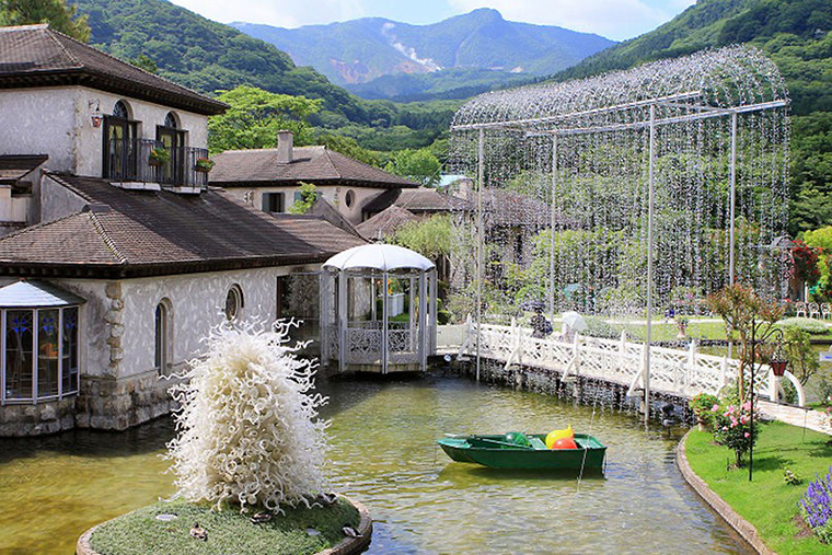 四季の花に彩られ、クリスタルガラスのツリーが輝く庭園に一歩足を踏み入れると、そこには異国情緒あふれる風景が広がっています。敷地内には、ヨーロッパ貴族を熱狂させたヴェネチアン・グラスの美術館をはじめ、水車小屋、おしゃれなカフェテラスが点在。イタリア人演奏者によるピアノやヴァイオリンなどの演奏が流れる空間で、非日常の世界に心を遊ばせることができます。