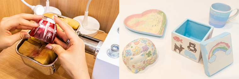 ゴールデンウィーク中の一押しは、お絵かきが好きな子どもたちが熱中する「ポタリーペインティング体験」。“素焼きの生地をキャンバスに自由な表現を”をコンセプトに、マグカップやシリアルボウルなどに絵付けをする。さまざまな模様のスタンプや筆を使って、小さな子どもから大人までどなたでもSNS映えするカラフルな作品を作ることができます。