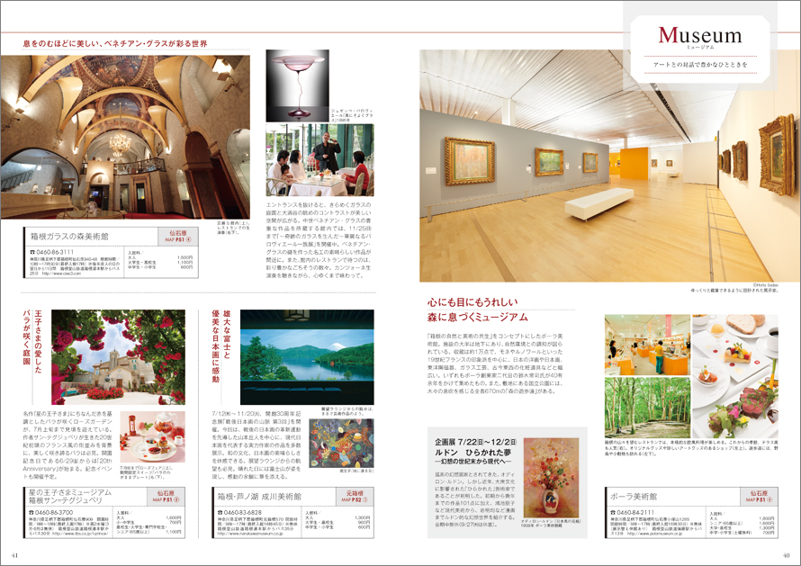 そして旅といえば、もちろんグルメ。和洋中のおいしいお店、そのほか美術館やイベントなど、お出かけがいっそう楽しくなる耳寄りな情報も満載。巻末には、掲載の施設やお店を訪ねるのに便利な地図も用意していますので、ぜひ、ご活用ください。