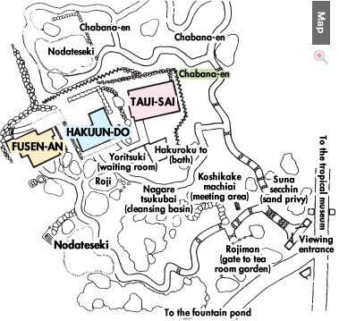 Chabana-en, situated behind the HAKUUN-DO Chaseki(tea rooms) complex, is a flower garden from which flowers for the tea room are collected. Different flowers bloom in each season. There are species which are commonly used in tea rooms, and other rare varieties to color the seasons.