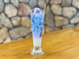 ➀商品内容 ライムのスッキリとした酸味とミントの爽やかなシロップをバタフライピーティーと合わせ、あじさいの色の移り変りをイメージした爽快ハーブティーです。