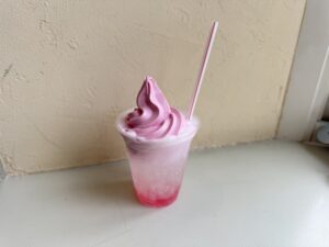 ➀商品内容 バラのソフトクリームに食べれるバラ、ベリーソース、サクサクのラスクにキラキラ輝くクラッシュゼリーが楽しめる、この時期だけの特別な商品です。