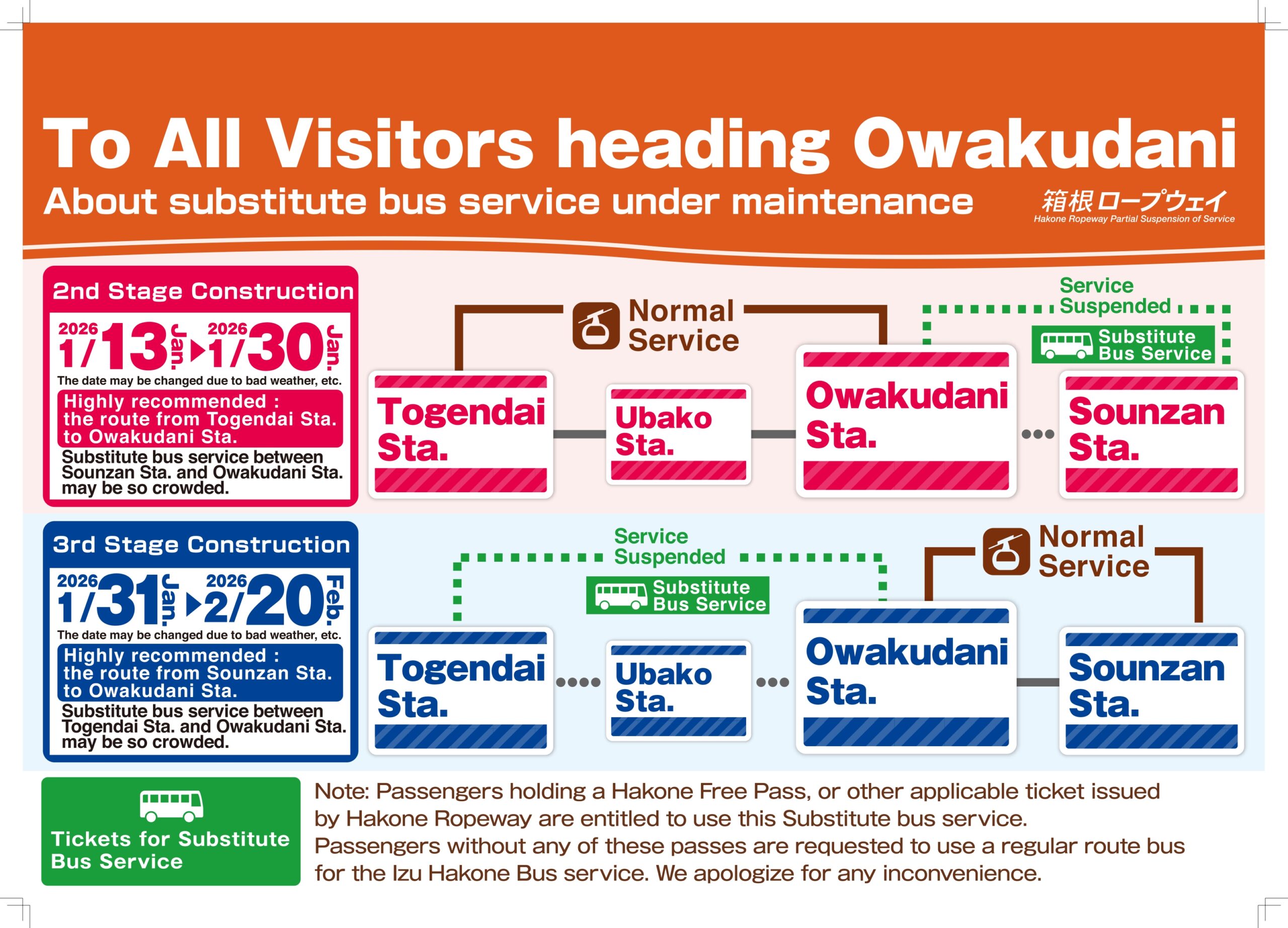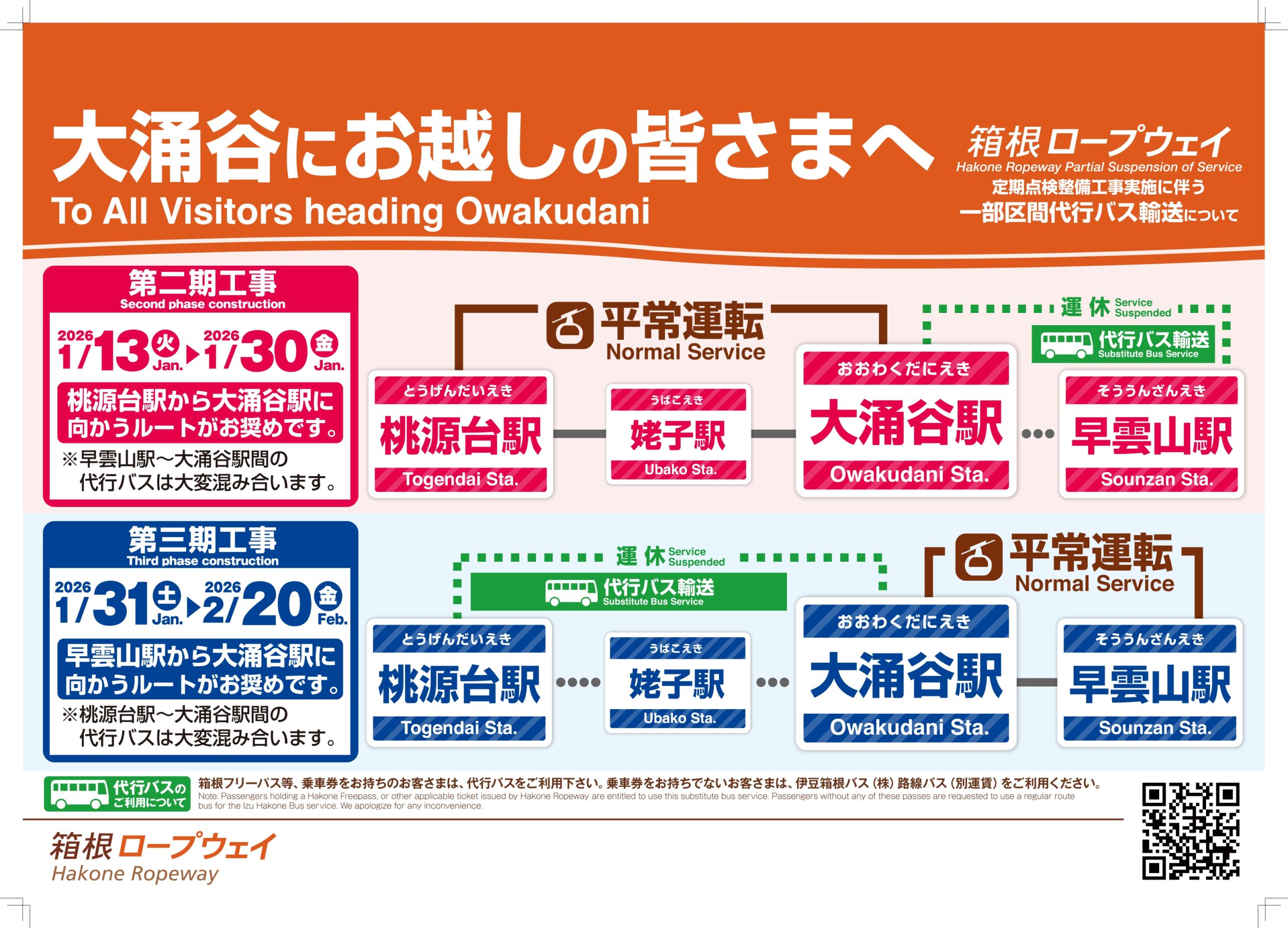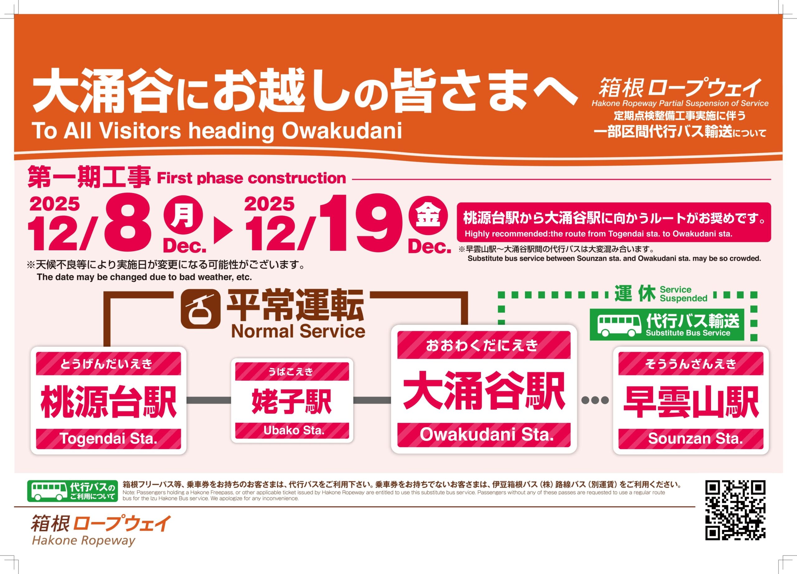 箱根ロープウェイでは定期点検整備工事のため、以下のとおり一部区間の営業運転を休止し、