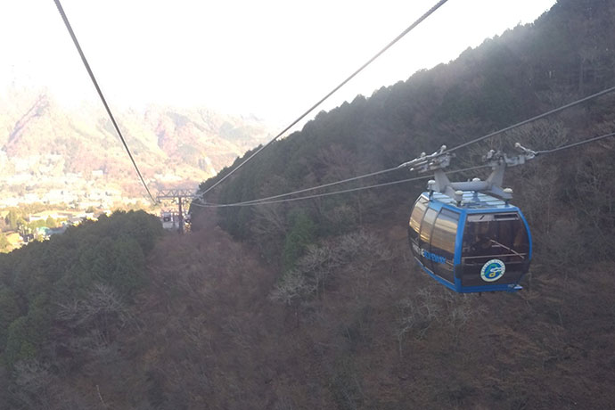 自箱根登山電車「箱根湯本站(OH51)」搭乘,於「強羅(ごうら)站(OH57)」下車(約40分鐘),換乘箱根登山纜索鐵路於「公園上站(OH59)」下車(3分鐘)
