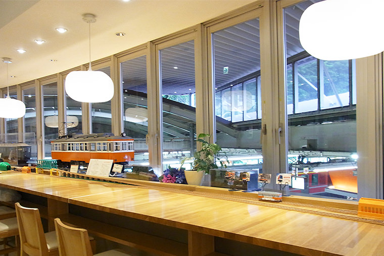 箱根湯本駅構内のカフェ。ドリンクと一緒に、パンやスイーツをご用意しています。窓際のソファ席からはロマンスカーの発着が見え、電車好きなお子様にも最適。また、店内に飾られた箱根登山電車の大型模型もお愉しみのひとつ。観光コースの確認、移動の待ち時間などにもご利用ください。