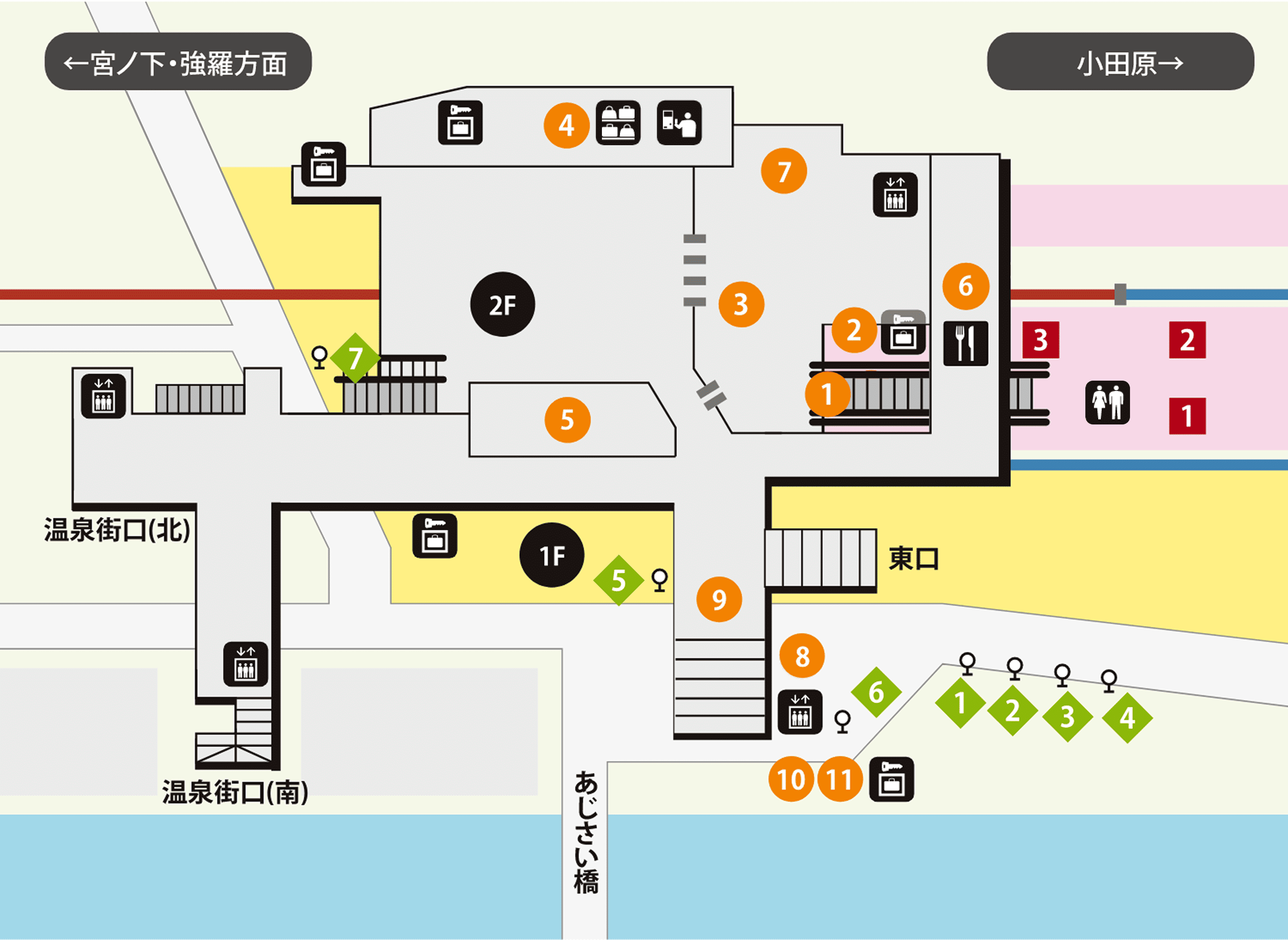 デッキ通路を通り、駅の向かい側にバスのりば(宮ノ下駅・小涌園・元箱根港・箱根町港・仙石・桃源台・畑宿・旧街道方面行きバス) がございます。 併設のエレベーター及びエスカレーター(上り専用)もご利用になれます。